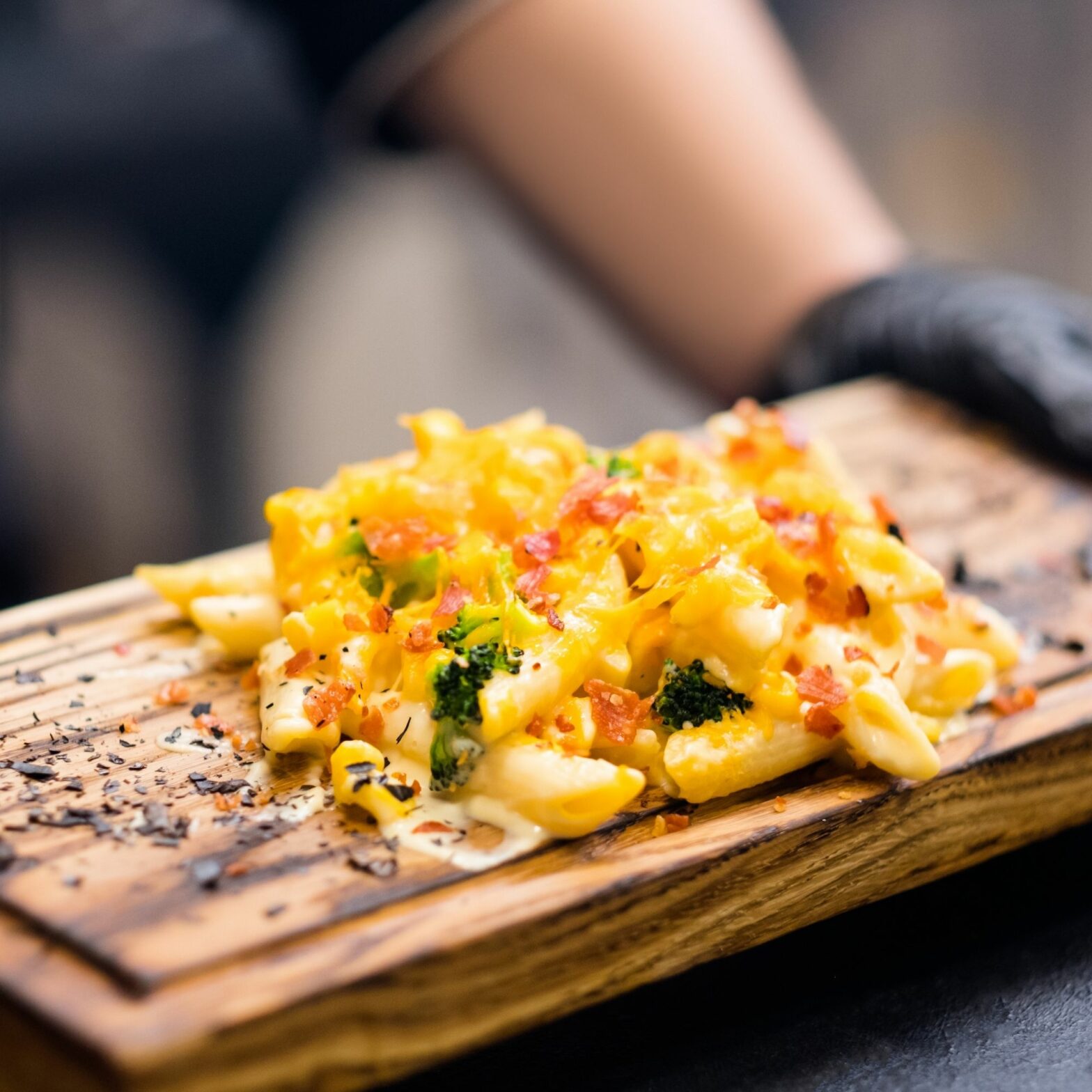 Drain macaroni. Add to sauce with bacon; mix lightly. Spoon into 1 1/2-quart casserole; top with remaining cheese.